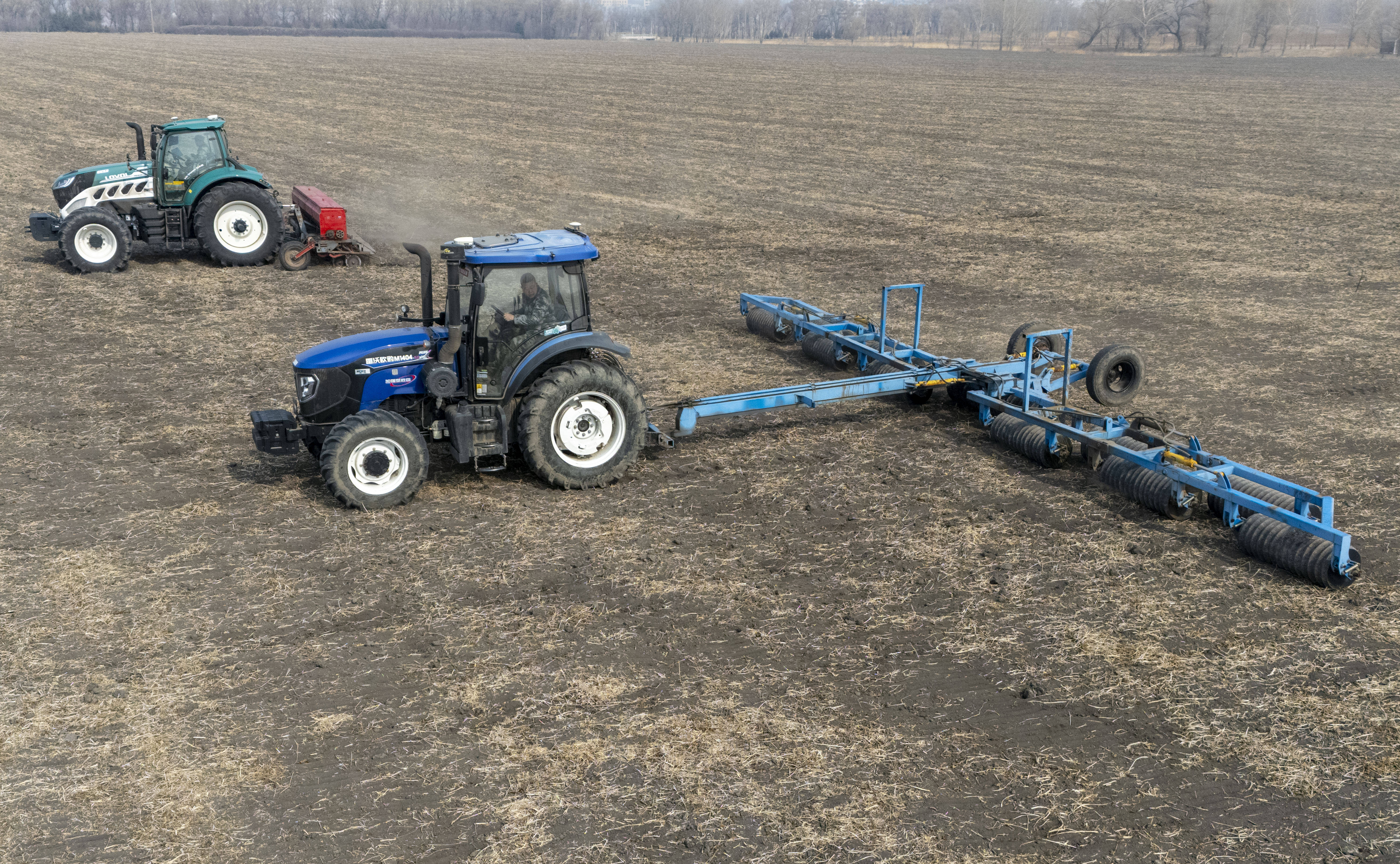 3月25日,农(nong)机(ji)在位于黑(hei)龙(long)江省哈尔(er)滨市的北大荒集团闫家岗农(nong)场有限公司一处耕地(di)上(shang)播种小麦(无(wu)人机(ji)照片)。 新华社记者 王松 摄
