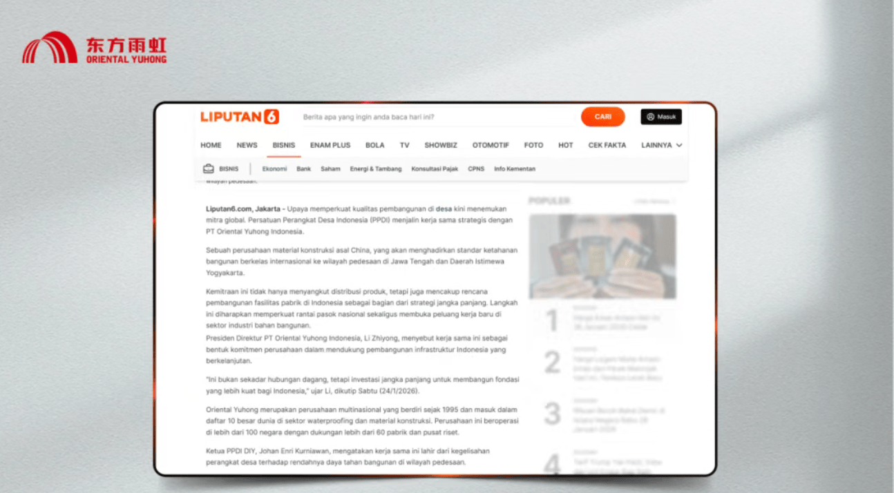 近日,印度尼西亚东(dong)方雨虹有限(xian)公司(PT.Oriental Yuhong Indonesia,以下简称“印尼东(dong)方雨虹”)与(yu)印度尼西亚乡村官员协会(Perkumpulan Perangkat Desa Indonesia,以下简称“PPDI”)正式签(qian)署战略合作协议。
