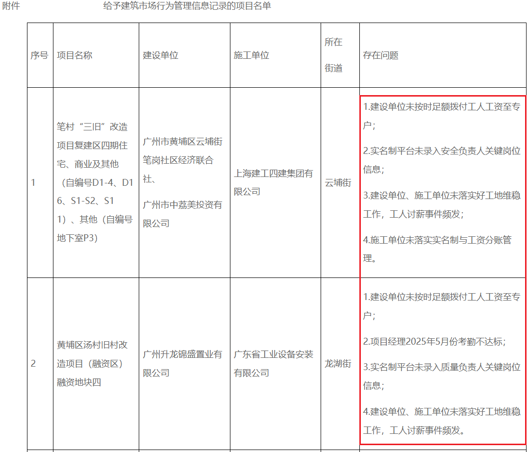 除了对这8个项目存在的环境进行转达外,开发区建设和(he)交通局(ju) 黄埔区住(zhu)房和(he)城乡建设局(ju)亦根据《广州市住(zhu)房和(he)城乡建设局(ju)关于开展施(shi)工、监(jian)理和(he)招标署(shu)理企业修建市场行为(wei)信用记录及(ji)经管信息发布工作(zuo)的通知》(穗修建〔2021〕451号)附件(jian) 1、2划定,对项目施(shi)工单位记录修建市场行为(wei)经管信息。
