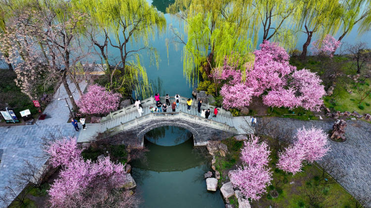 气温回升,绽(zhan)放的春花(hua)带来盎然的春意,人(ren)们纷纷走到户外,探春赏花(hua)。图为旅客在(zai)扬州市瘦西湖(hu)风景区(qu)赏景游玩(无人(ren)机(ji)照片)。(新华社发 齐立广(guang) 摄)