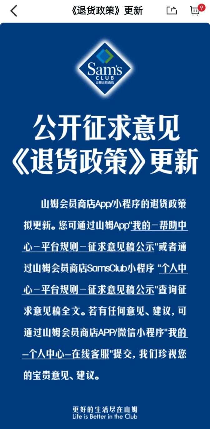近日,很多消费者在山姆会员商店App发明一条通(tong)告——《退货政(zheng)策》更新正在公然征求(qiu)意见。