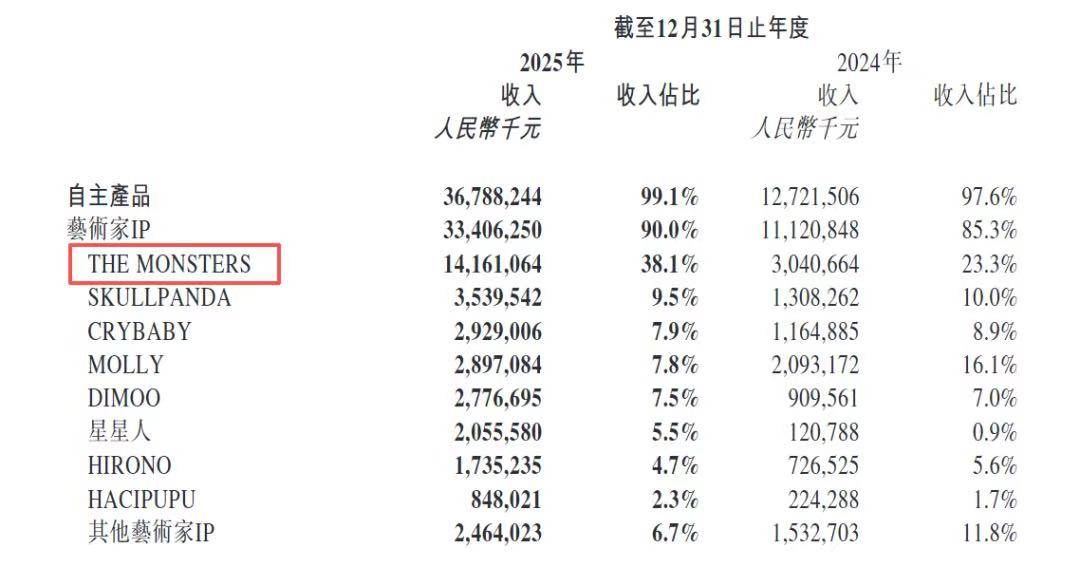 但成绩在于,IP生态的构建速度,似乎远远赶没有上对单一IP依赖加深的速度。财报(bao)显示,LABUBU家属的营(ying)收占(zhan)比从2024年的23.3%跃升至2025年的38.1%;其他IP固然也(ye)孝敬过亿支出,但无论(lun)是体量照样(yang)增速,都(dou)无法(fa)与LABUBU相(xiang)提并论(lun);MOLLY系列(lie)支出占(zhan)比更是从2024年的16.1%下跌至2025年的7.8%。