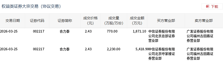 3月25日(ri),合力泰(tai)大宗交易成交3000万股,成交额7290万元,占(zhan)当日(ri)总成交额的(de)12.29%,成交价2.43元,较市(shi)场开盘价2.48元折价2.02%。