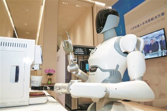 | 大会现(xian)场(chang)的(de)广东省制作业与(yu)服(fu)务业协同发展(zhan)案例展(zhan)现(xian)区,机器人演示接取咖(ka)啡 |