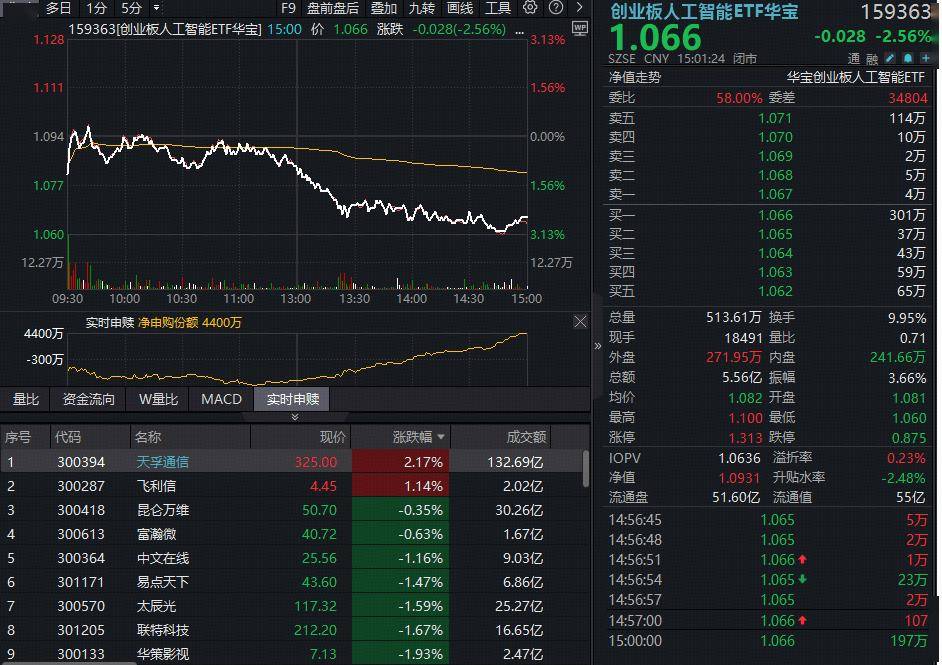 抢手ETF方面,同类规(gui)模、活动性第一的创业板人工智能ETF华宝(159363)午后跳水走弱,收跌2.56%,缩量成交5.56亿元。板块处于(yu)箱体(ti)震动阶段,资金呈现低(di)吸高抛的特征,今日(ri)借道159363逢跌净申购4400万份。