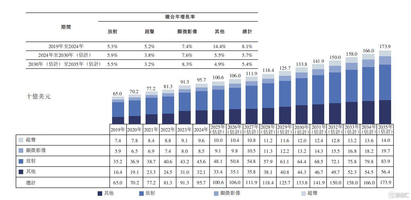 全(quan)球医学影像(xiang)检测市场连结稳健增长,2024年规模约(yue)957亿美(mei)元,预计2030年增至1338亿美(mei)元,2035年进一步提(ti)升至1739亿美(mei)元,2024-2030年复合(he)年增长率(lu)为5.7%;我国市场增速明(ming)显高于全(quan)球,2024年规模999亿元人(ren)民币,2030年将达1590亿元人(ren)民币,2035年升至2193亿元人(ren)民币,2024-2030年复合(he)年增长率(lu)为8.1%,显现出强劲的增长潜力(li)与广阔的市场空(kong)间。
