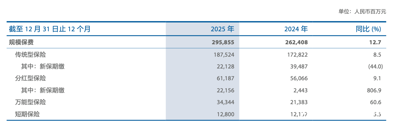 我国太保在财报中表示,客(ke)岁公司产品转型效果展现(xian),产品结构持续优化,浮动收益型产品占(zhan)比显著(zhu)提升;强(qiang)化营业品质管理,保单继续率保持高位。按营业类型来看,2025年,太保寿险商保年金(jin)新保规模保费(fei)430.42亿元,同比增长93.4%;康(kang)健险新保规模保费(fei)138.45亿元,同比增长2.8%;分(fen)红型保险新保期缴规模保费(fei)221.56亿元,新保期缴平分(fen)红险占(zhan)比提升至50.0%。