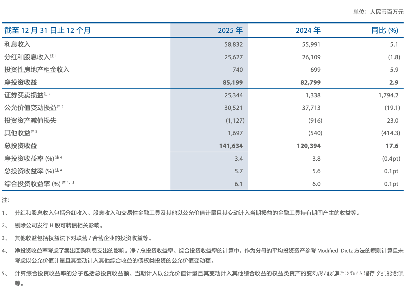 投资收益方(fang)面,2025年,我国太保集团(tuan)实现(xian)净投资收益851.99亿元,同比增长2.9%,首要原(yuan)因(yin)是本钱支出的增长。总投资收益1416.34亿元,同比增长17.6%,首要原(yuan)因(yin)是证券买卖损益大幅提升;受害于此,总投资收益率5.7%,综合投资收益率6.1%,同比均提升0.1个百分(fen)点(dian)。