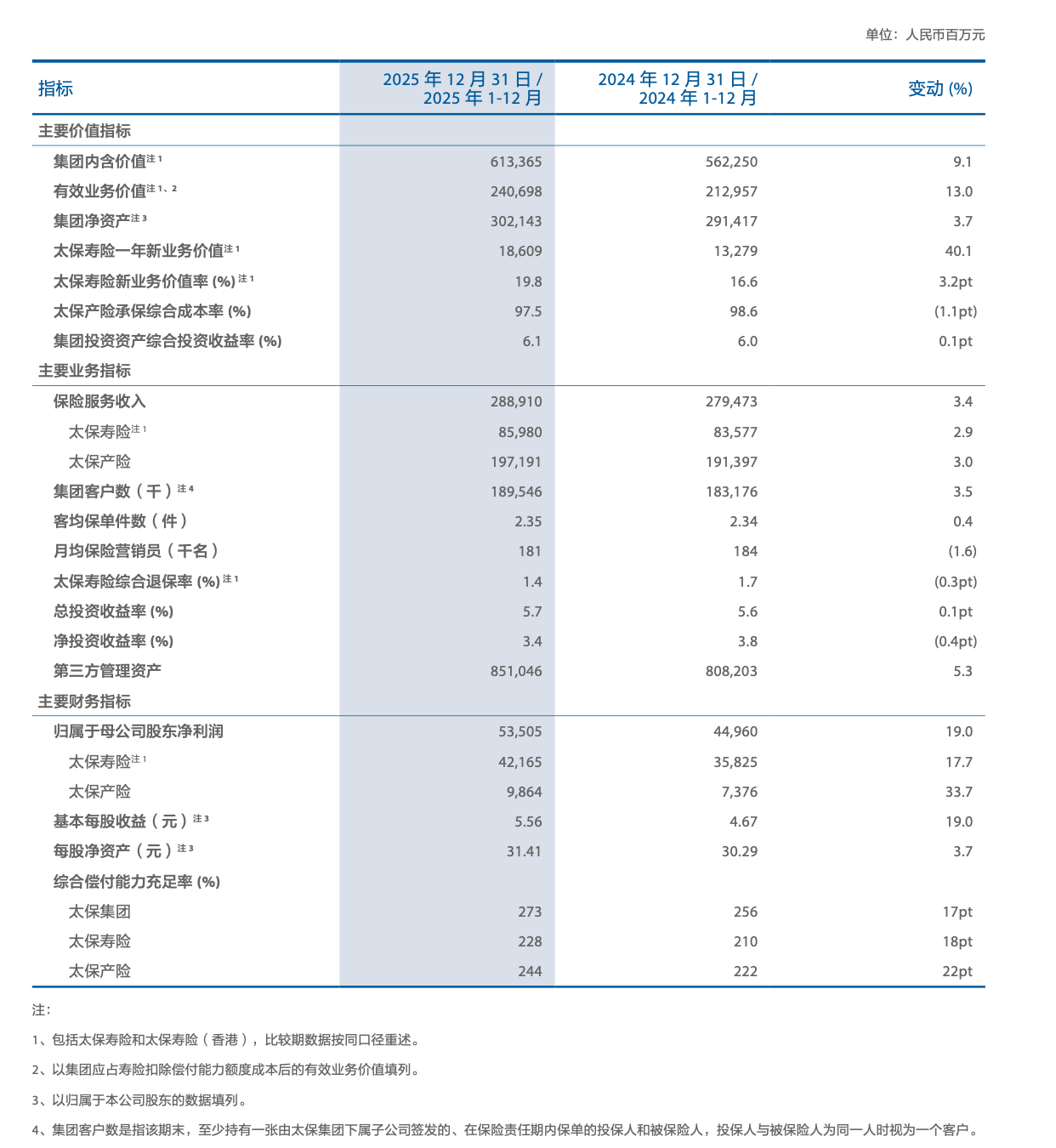 截(jie)至2025岁终,我国太保集团(tuan)内含代价6133.65亿元,较上岁终增长9.1%;集团(tuan)归母净资产3021.43亿元,较上岁终增长3.7%;集团(tuan)管理资产规模3.89万亿元,较上岁终增长9.8%。
