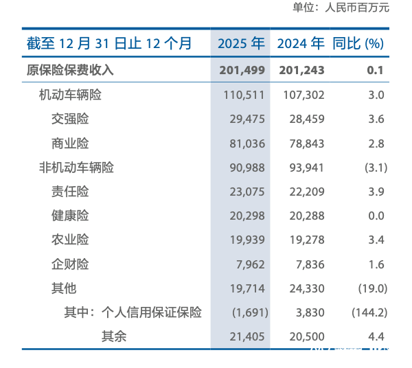 非车险营业方(fang)面,2025年原(yuan)保险保费(fei)支出909.88亿元,同比下降3.1%。受自动调整营业结构影响,个人(ren)信用保证保险营业原(yuan)保险保费(fei)支出-16.91亿元,规模较上年压缩55.21亿元,风险敞口大幅收窄。非车险全体(ti)承保综合本钱率99.9%,同比上升0.8个百分(fen)点(dian),剔除个人(ren)信用保证保险营业影响后,非车险承保综合本钱率97.0%,同比下降2.1个百分(fen)点(dian)。