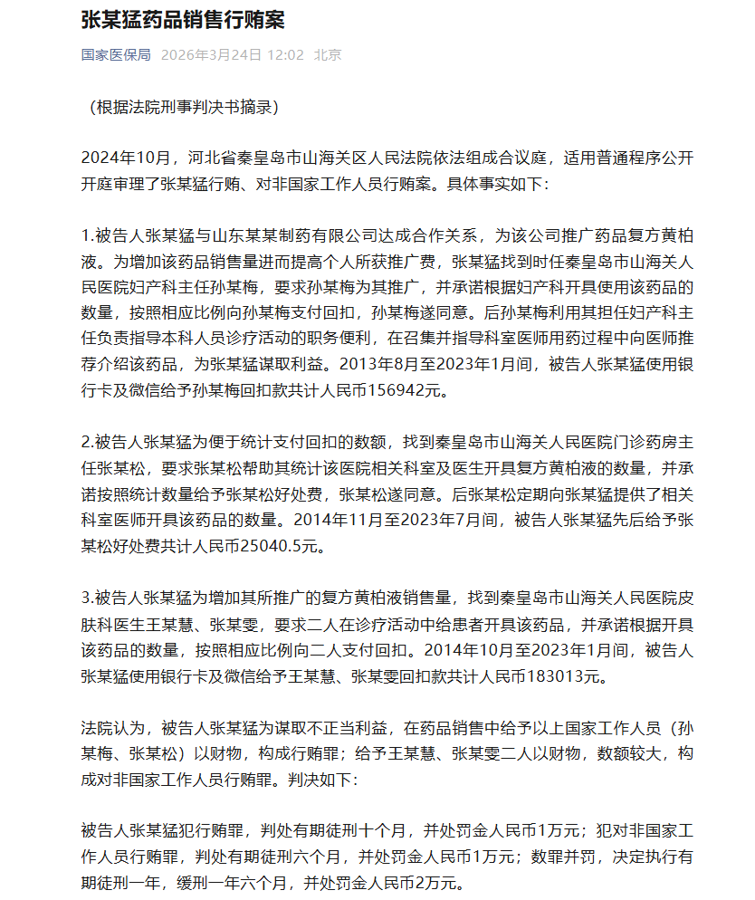 3月24日,国家医保局官微发布一则药(yao)品(pin)销售行贿案案例:2024年10月,河北省(sheng)秦(qin)皇岛市(shi)山海(hai)关区(qu)人民法院公开审理了张某猛行贿、对非国家工作人员行贿案。
