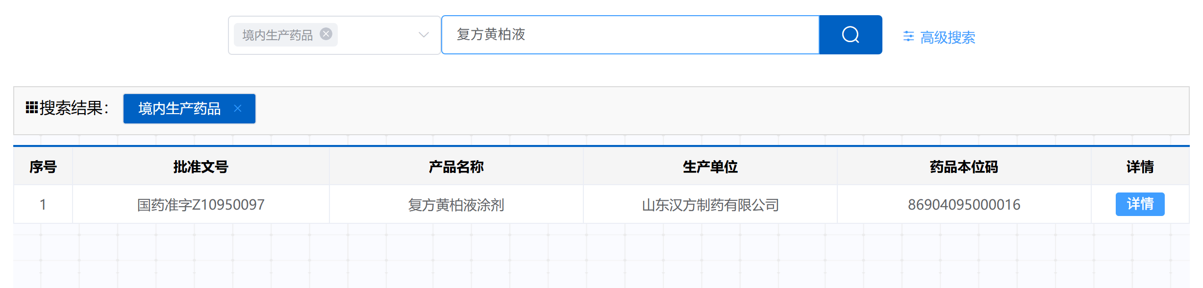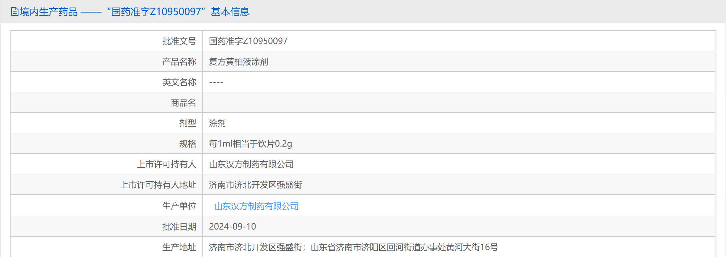 界面新闻记者在(zai)国家药(yao)监局查询(xun)发现,复方黄柏液(ye)为独(du)家品(pin)种(zhong),上市(shi)许可持(chi)有人、生产单位均为山东汉方制(zhi)药(yao)(下称“汉方制(zhi)药(yao)”)。换而言之,国家医保局点名(ming)的“山东某某制(zhi)药(yao)”即为汉方制(zhi)药(yao)。