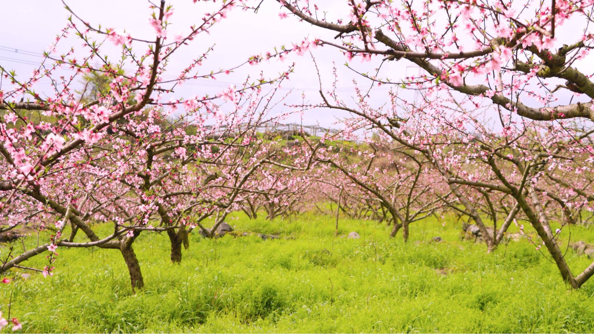 走进桃林,放眼望去,层层叠叠的山坡上,一株株桃树参差成片,枝(zhi)头(tou)缀满了盛开的桃花。粉红色的花瓣在阳光照(zhao)耀下(xia)格(ge)外娇艳,微(wei)风(feng)拂(fu)过,花瓣随风(feng)起舞,空气中弥漫着淡淡的花香气扑鼻。